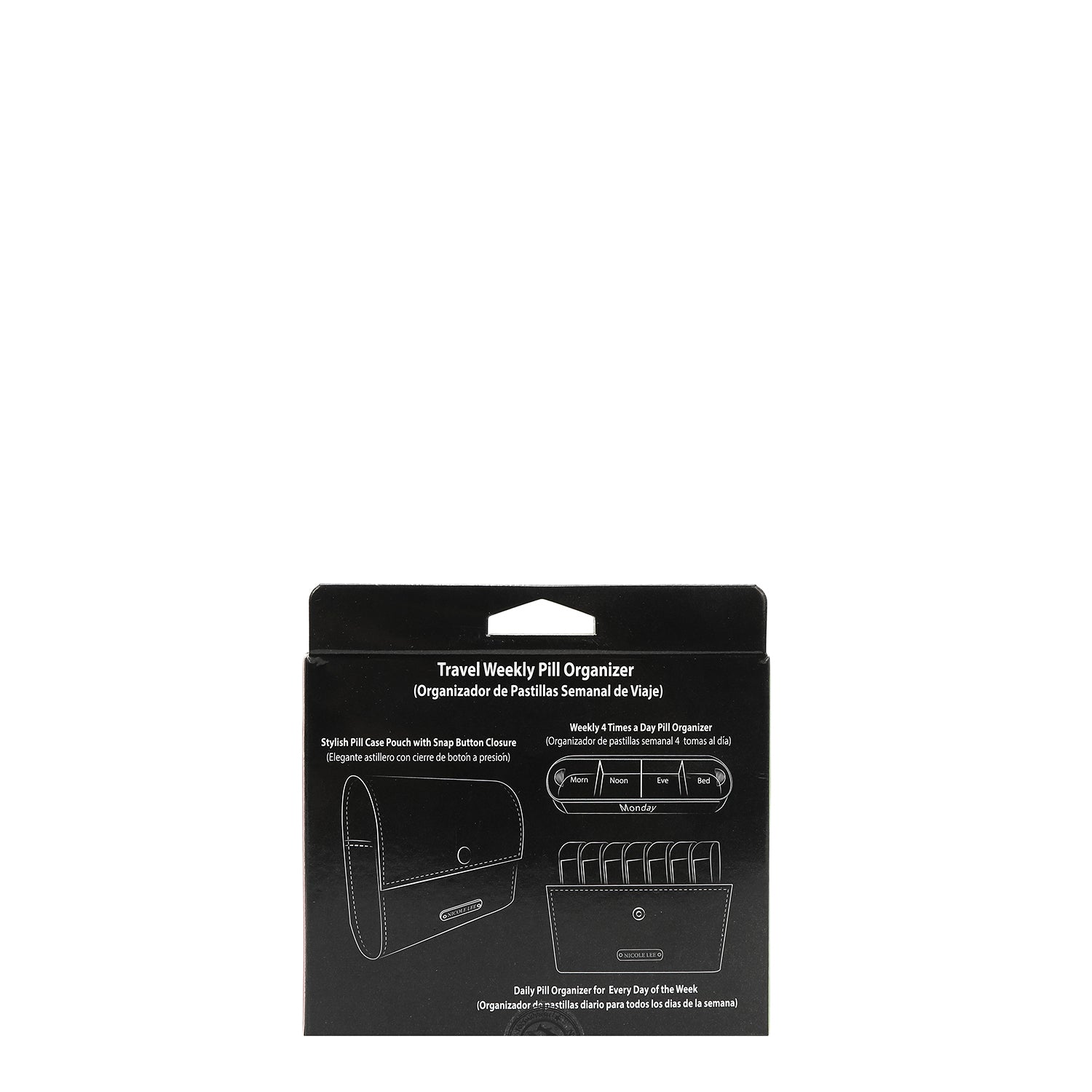 - Includes vegan leather pouch with fold-over flap and snap button closure and daily pill cases