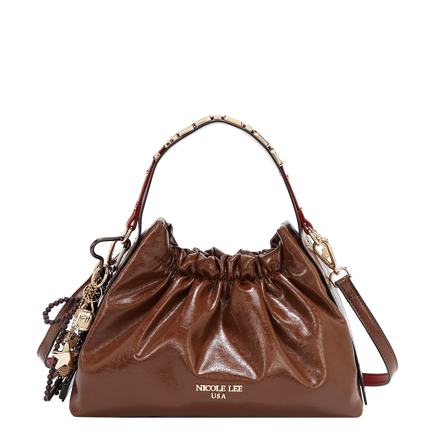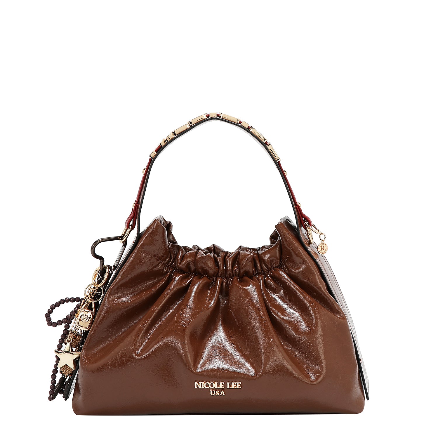 - Flat top handle with gold-tone metal "nicole lee" logo letters (5" drop) with Nicole Lee