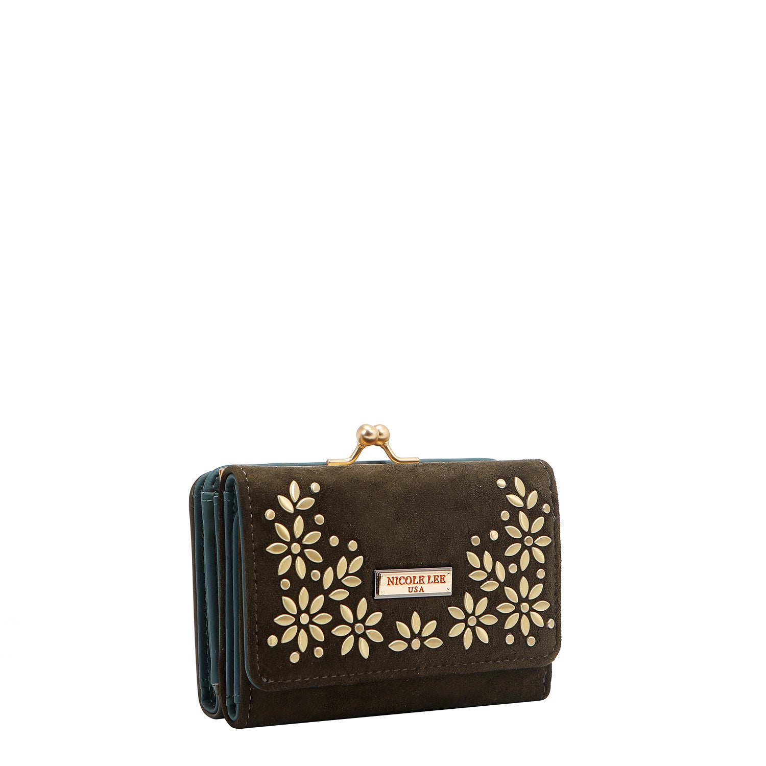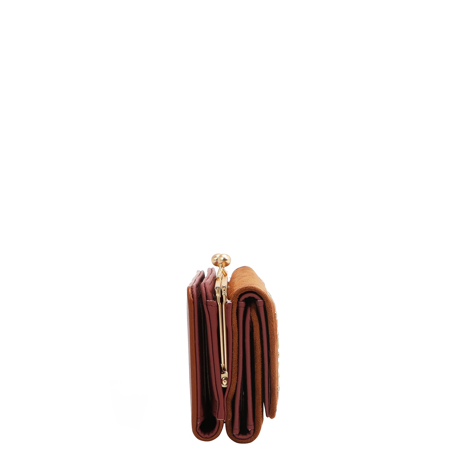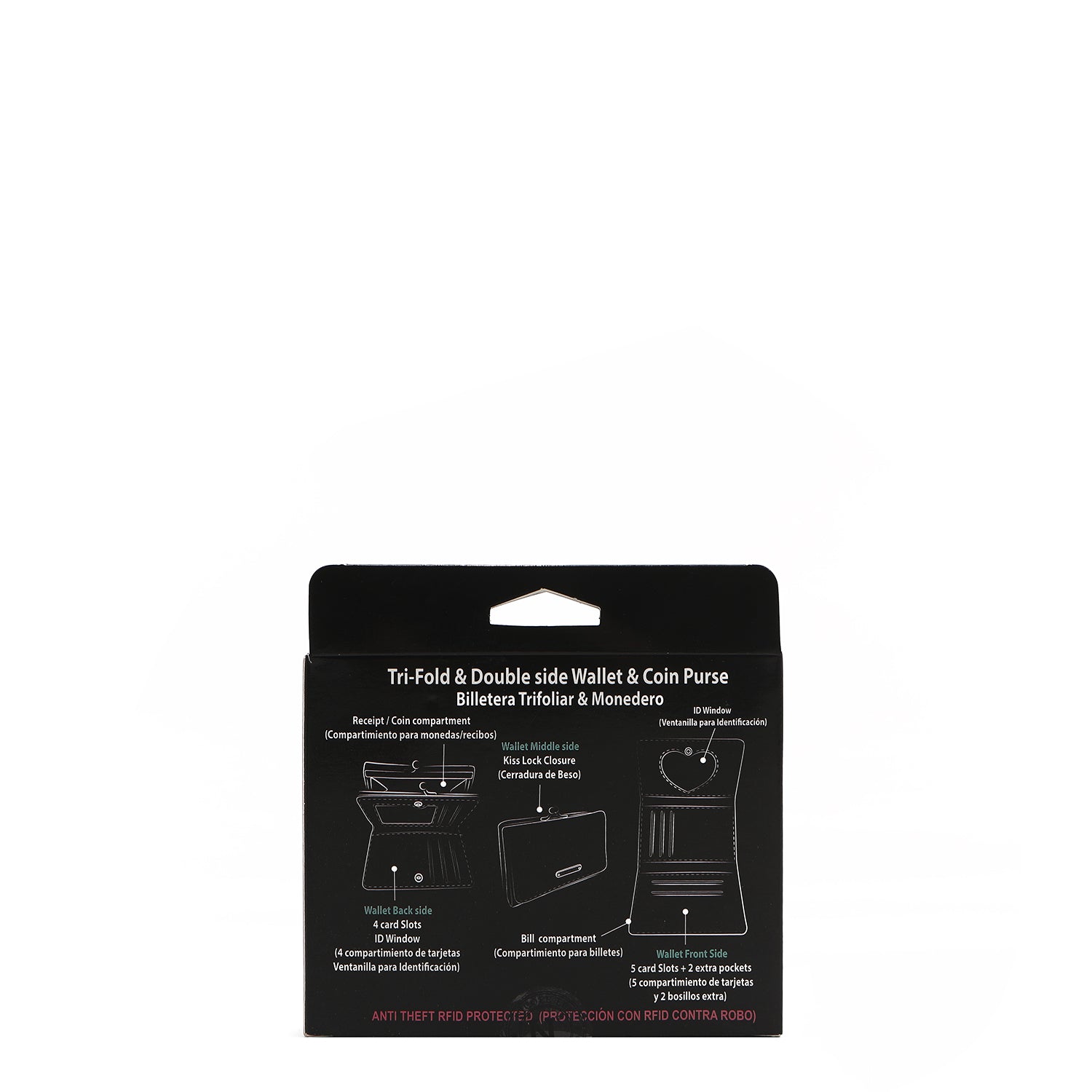 • Front fold-over flap with snap button closure opens up to a trifold interior with 1 heart-shaped ID window, 2 note/cash sleeves, 5 card slots