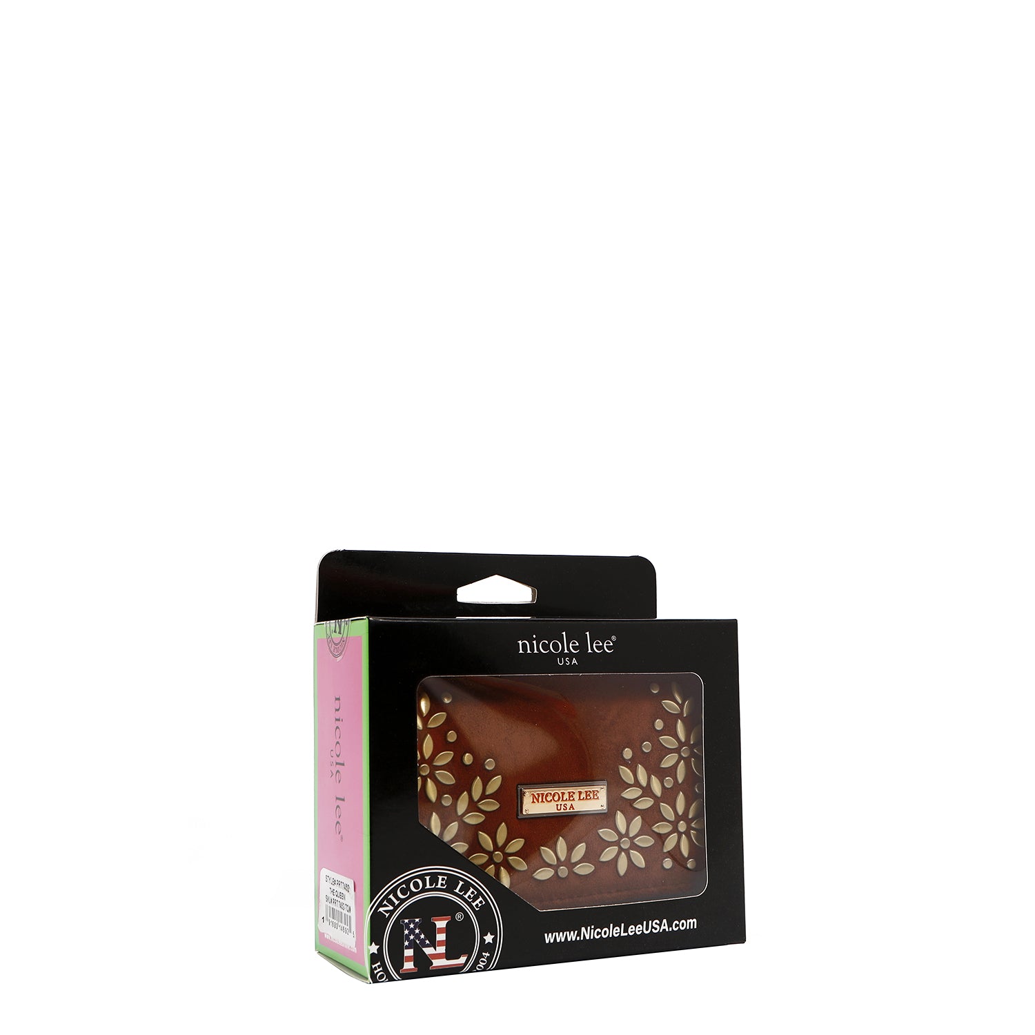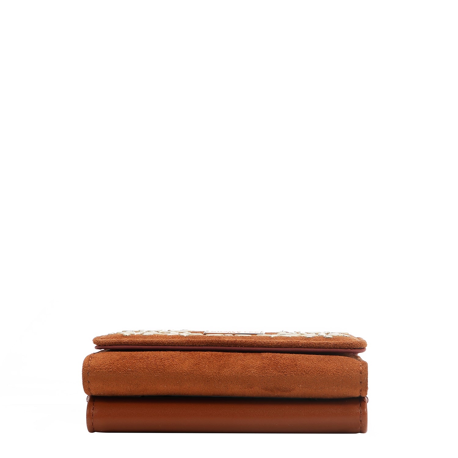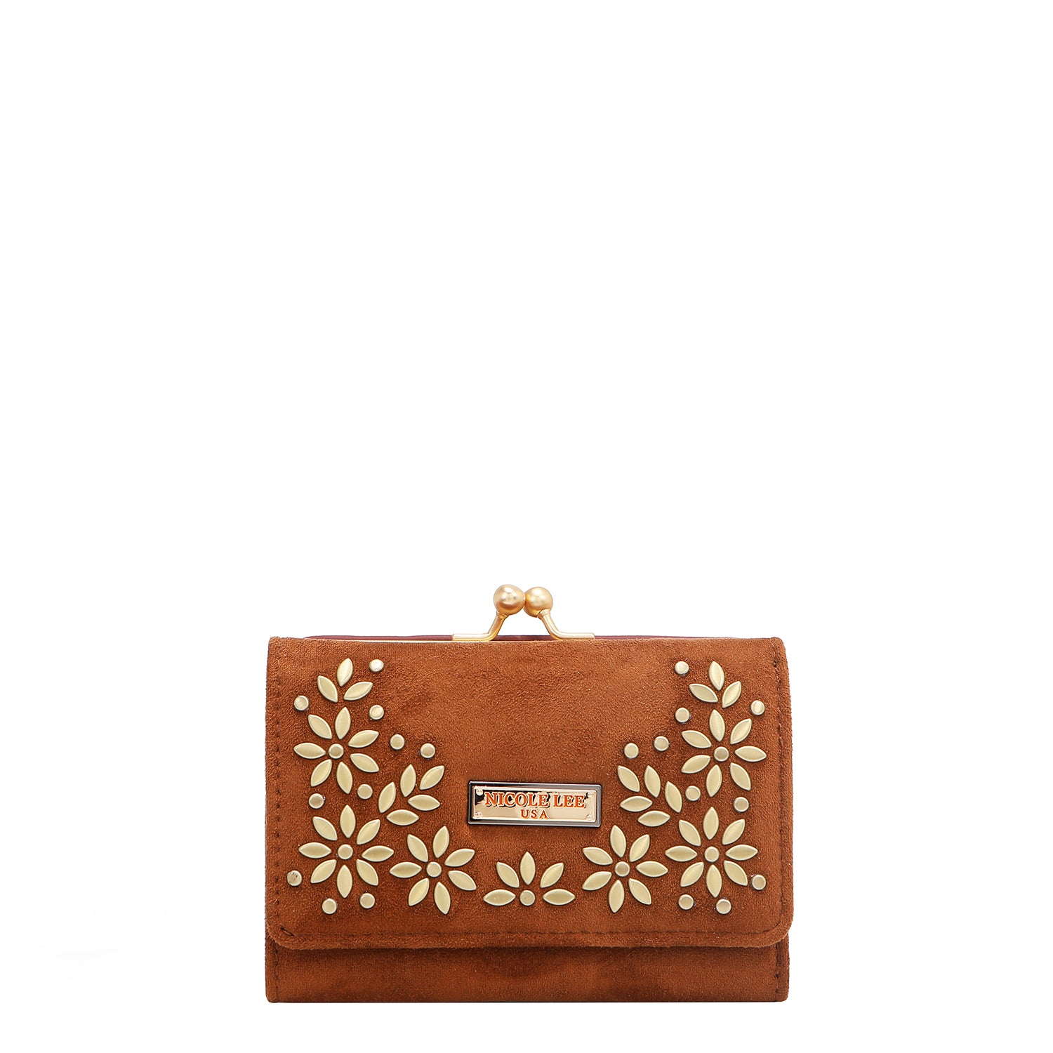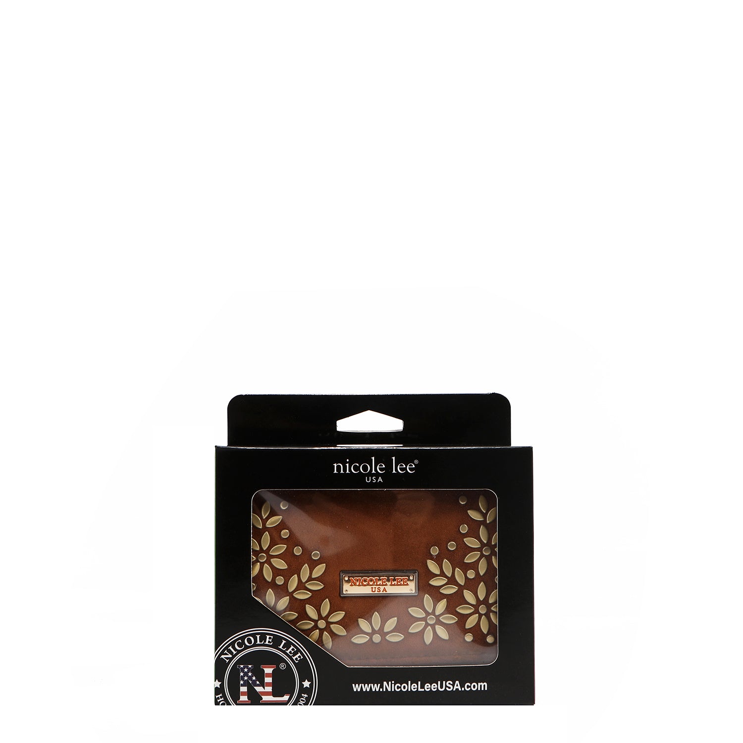 • Front fold-over flap with snap button closure opens up to a trifold interior with 1 heart-shaped ID window, 2 note/cash sleeves, 5 card slots