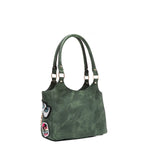 Add a fun twist to any outfit with our trendy multi patch shoulder bag, featuring a cheerful patch design and a chic vegan leather exterior that mimics denim.